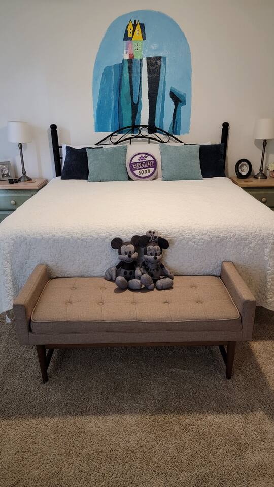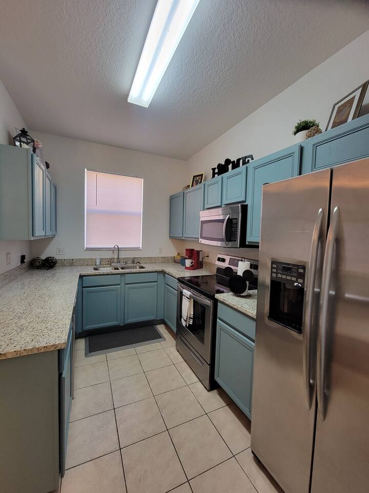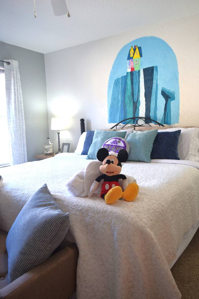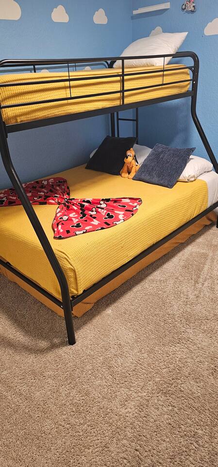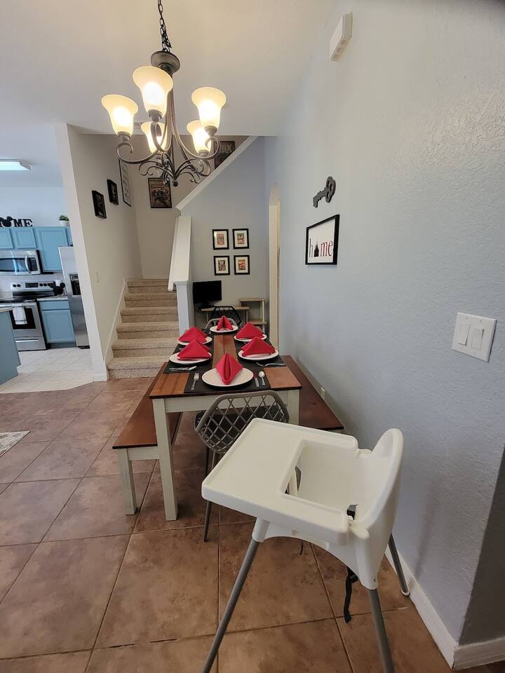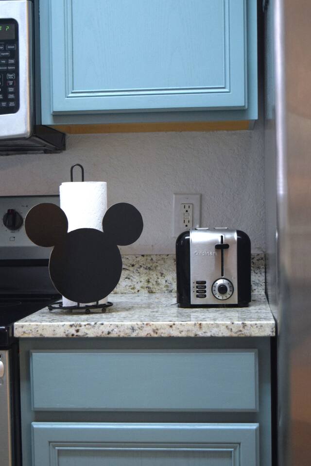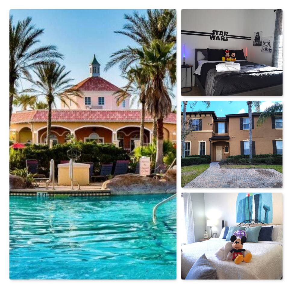 🏡 Your Home Away From Home at Mouse House Hideaway❤️ Relax in a beautifully themed 4-bedroom, 3-bath townhouse designed with families and fun in mind! ✨ Themed Bedrooms “UP” Master Suite – King pillow-top bed, 42" HDTV, private bathroom with soaker tub. “Toy Story” Room – Twin, full, and trundle beds; 32" HDTV. “Harry Potter” Room – Two twin beds; 32" HDTV. “Star Wars” Room – Queen pillow-top bed; 32" HDTV; attached shared bathroom. 🍽️ Fully Equipped Kitchen Keurig coffee maker, toaster, blender Pots, pans, cooking utensils Plates, cups, silverware Bottle opener and more 🛋️ Family Room & Dining Comfortable sofa and seating 65" HDTV – perfect for movies or sports Board games Dining table with benches and chairs Outdoor patio with two chairs 👶 Kid & Baby Gear Highchair Pack-n-play (Porta-crib) Sit/stand stroller Family-friendly amenities 💻 Other Amenities Free Wi-Fi & Cable TV Desk/workstation with monitor Washer & dryer Hairdryers in all bathrooms New dishwasher & granite countertops Private parking for 2 large or 3 small vehicles Comfortable furniture and quality mattresses --- 🌴 Regal Palms Resort Amenities (Just a 2-minute walk!) 2 Heated Pools & Lazy River Waterslide (fun for kids and adults!) Indoor & outdoor hot tubs Poolside lounge chairs Tiki Bar (seasonal) & family-friendly Bar & Grill Ice cream parlor Arcade room, playground, and fitness center Full-service Spa (by appointment) Small convenience store and business center Theme park ticket retailer Family crafts & weekend activities --- 🧴 What We Provide This is a self-service rental. We supply: 1 roll of toilet paper per bathroom 1 roll of paper towels Hand soap 1 dishwasher pod Additional supplies should be brought or purchased as needed.