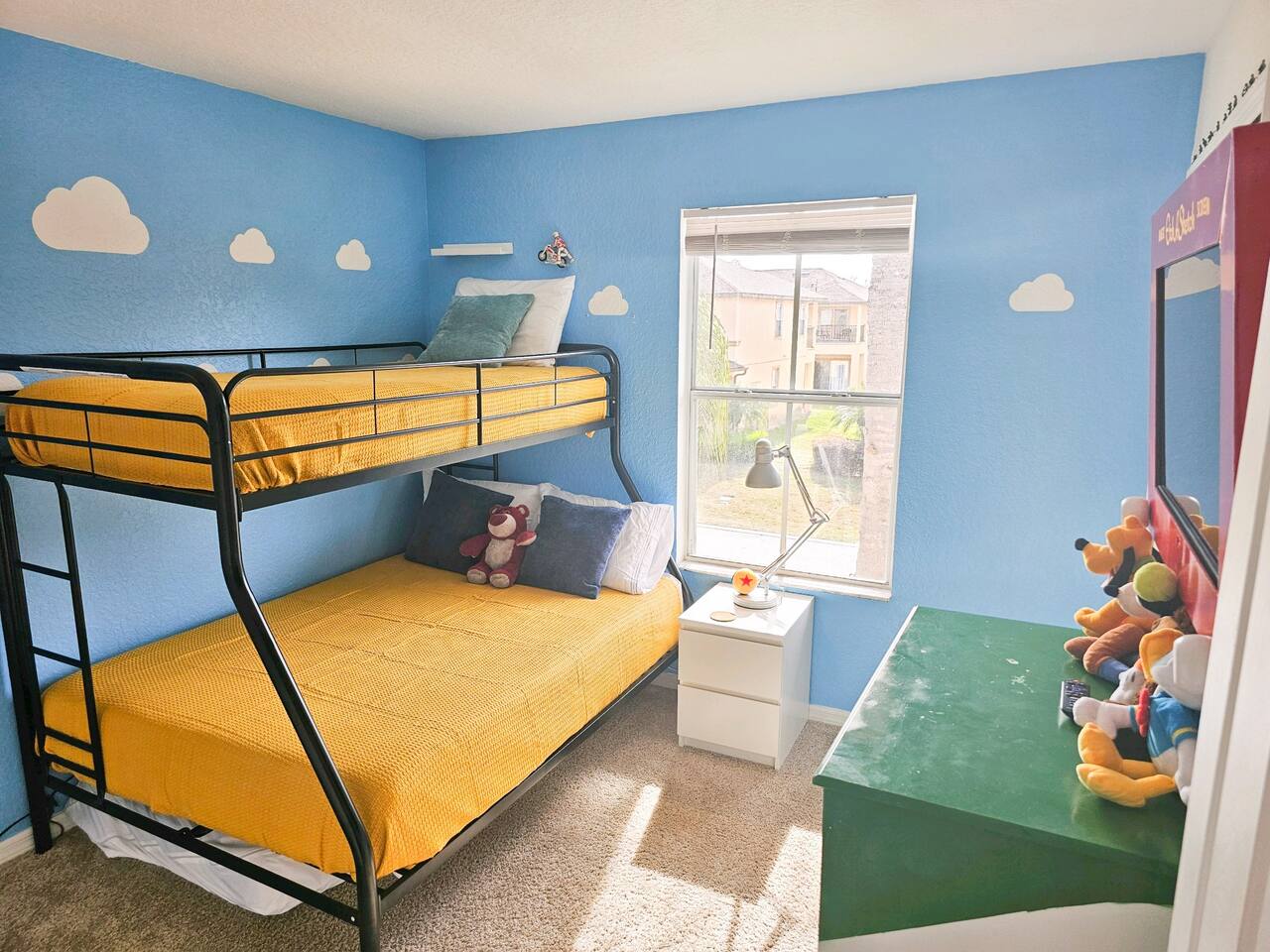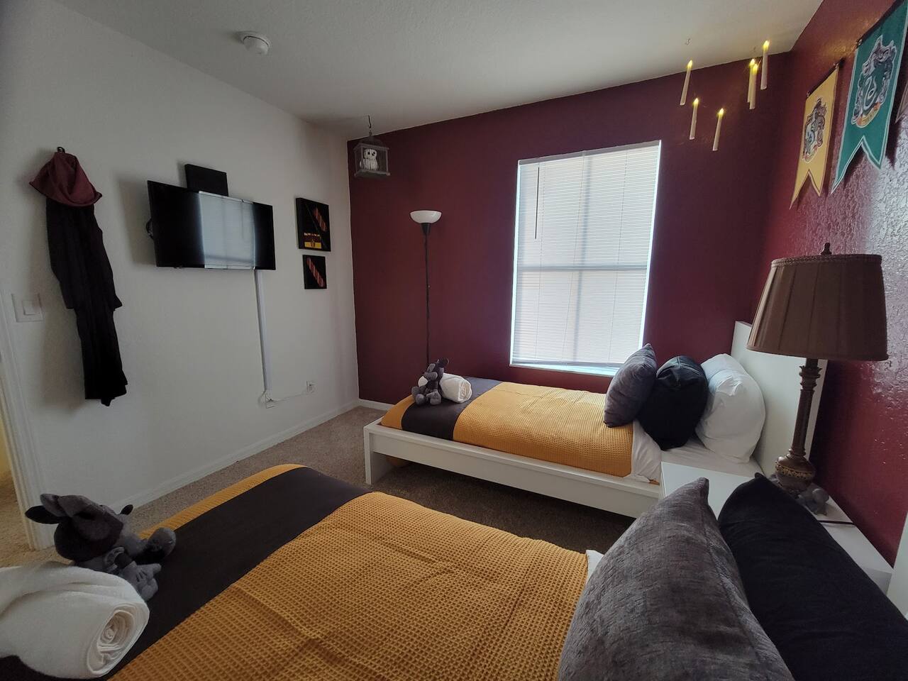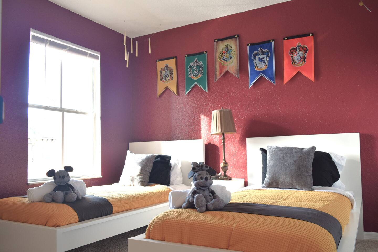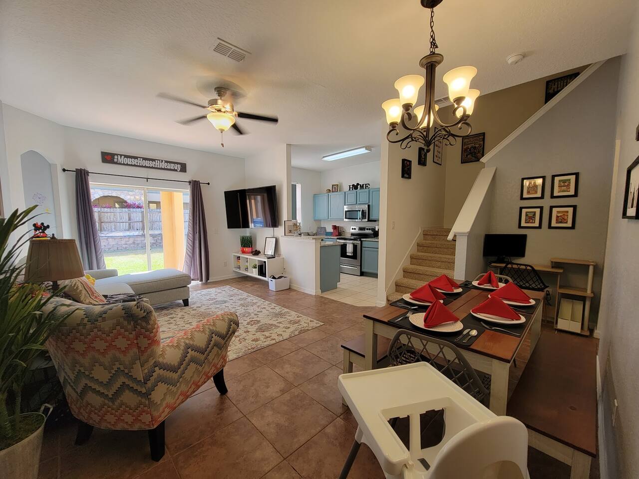 🏡 Your Home Away From Home at Mouse House Hideaway❤️ Relax in a beautifully themed 4-bedroom, 3-bath townhouse designed with families and fun in mind! ✨ Themed Bedrooms “UP” Master Suite – King pillow-top bed, 42" HDTV, private bathroom with soaker tub. “Toy Story” Room – Twin, full, and trundle beds; 32" HDTV. “Harry Potter” Room – Two twin beds; 32" HDTV. “Star Wars” Room – Queen pillow-top bed; 32" HDTV; attached shared bathroom. 🍽️ Fully Equipped Kitchen Keurig coffee maker, toaster, blender Pots, pans, cooking utensils Plates, cups, silverware Bottle opener and more 🛋️ Family Room & Dining Comfortable sofa and seating 65" HDTV – perfect for movies or sports Board games Dining table with benches and chairs Outdoor patio with two chairs 👶 Kid & Baby Gear Highchair Pack-n-play (Porta-crib) Sit/stand stroller Family-friendly amenities 💻 Other Amenities Free Wi-Fi & Cable TV Desk/workstation with monitor Washer & dryer Hairdryers in all bathrooms New dishwasher & granite countertops Private parking for 2 large or 3 small vehicles Comfortable furniture and quality mattresses --- 🌴 Regal Palms Resort Amenities (Just a 2-minute walk!) 2 Heated Pools & Lazy River Waterslide (fun for kids and adults!) Indoor & outdoor hot tubs Poolside lounge chairs Tiki Bar (seasonal) & family-friendly Bar & Grill Ice cream parlor Arcade room, playground, and fitness center Full-service Spa (by appointment) Small convenience store and business center Theme park ticket retailer Family crafts & weekend activities --- 🧴 What We Provide This is a self-service rental. We supply: 1 roll of toilet paper per bathroom 1 roll of paper towels Hand soap 1 dishwasher pod Additional supplies should be brought or purchased as needed.